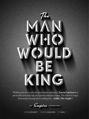 Client: Empire Magazine Year: 2016 The Man who would be King, Type Opener (Featuring Taron Egerton ) Words: Chris Hewitt | Portraits: Sarah Dunn | ...